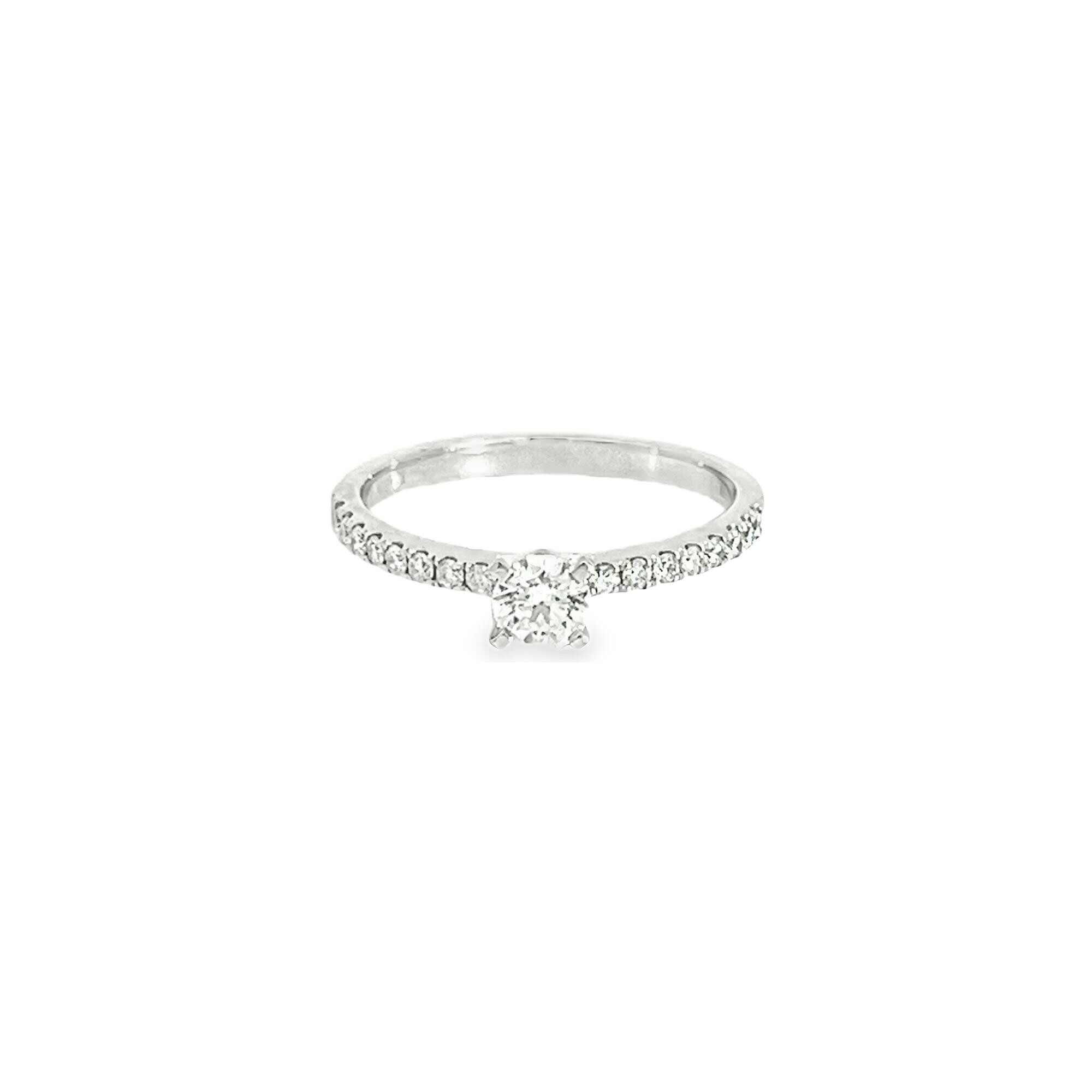 Ce solitaire accompagné en diamants et or blanc 750/1000 est le symbole parfait de l'élégance et du raffinement. Avec son design délicat et ses pierres scintillantes, elle attire tous les regards et ajoute une touche de glamour à n'importe quelle tenue.